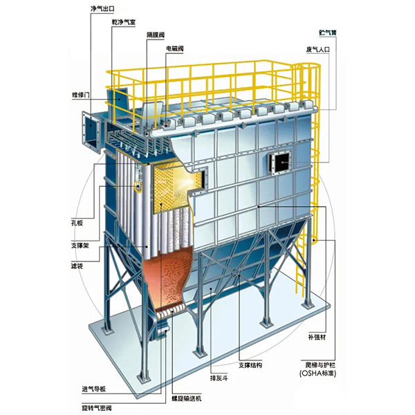 1、長袋離線脈沖袋式除塵器為箱體結構,主要由桁架、灰斗、中部箱體、上部箱體、噴吹裝置、梯子及平臺、進出口風管、PLC控制系統八部分組成。