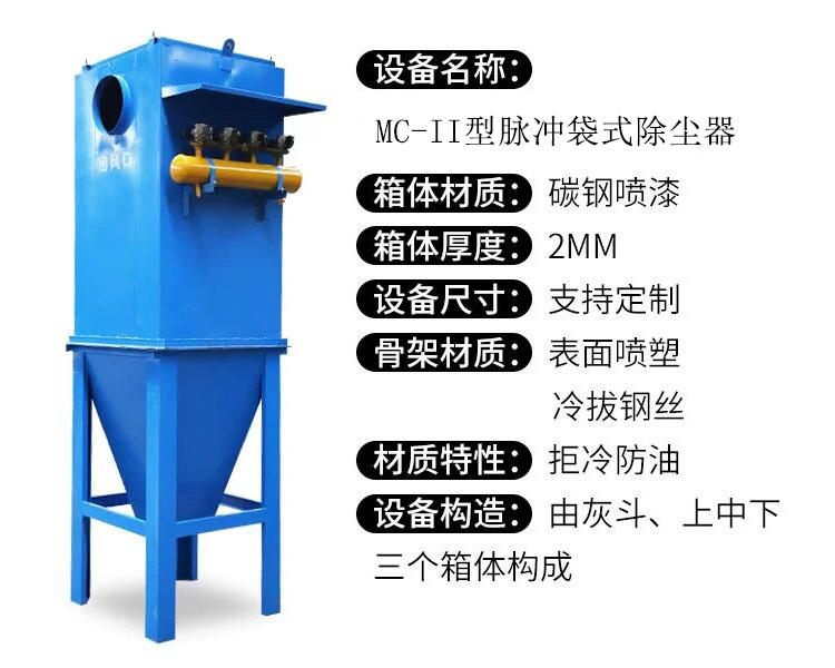 MC脈沖布袋除塵器屬于一種干式濾塵裝置,主要由上部箱體、中部箱體、下部箱體(灰斗)、清灰系統和排灰機構等部分組成。其中一個重要的部分是濾袋,而袋式除塵器的濾袋采用紡織的濾布或非紡織的氈制成,利用纖維織物的過濾作用對含塵氣體進行過濾,當含塵氣體進入袋式除塵器,顆粒大、比重大的粉塵,由于重力的作用沉降下來,落入灰斗,含有較細小粉塵的氣體在通過濾料時,粉塵被阻留,使氣體凈化,所以該產品的使用目的是清理粉塵,保護環境,所以從產品的整體性能特點來看,它適用于捕集細小、干燥、非纖維性粉塵。